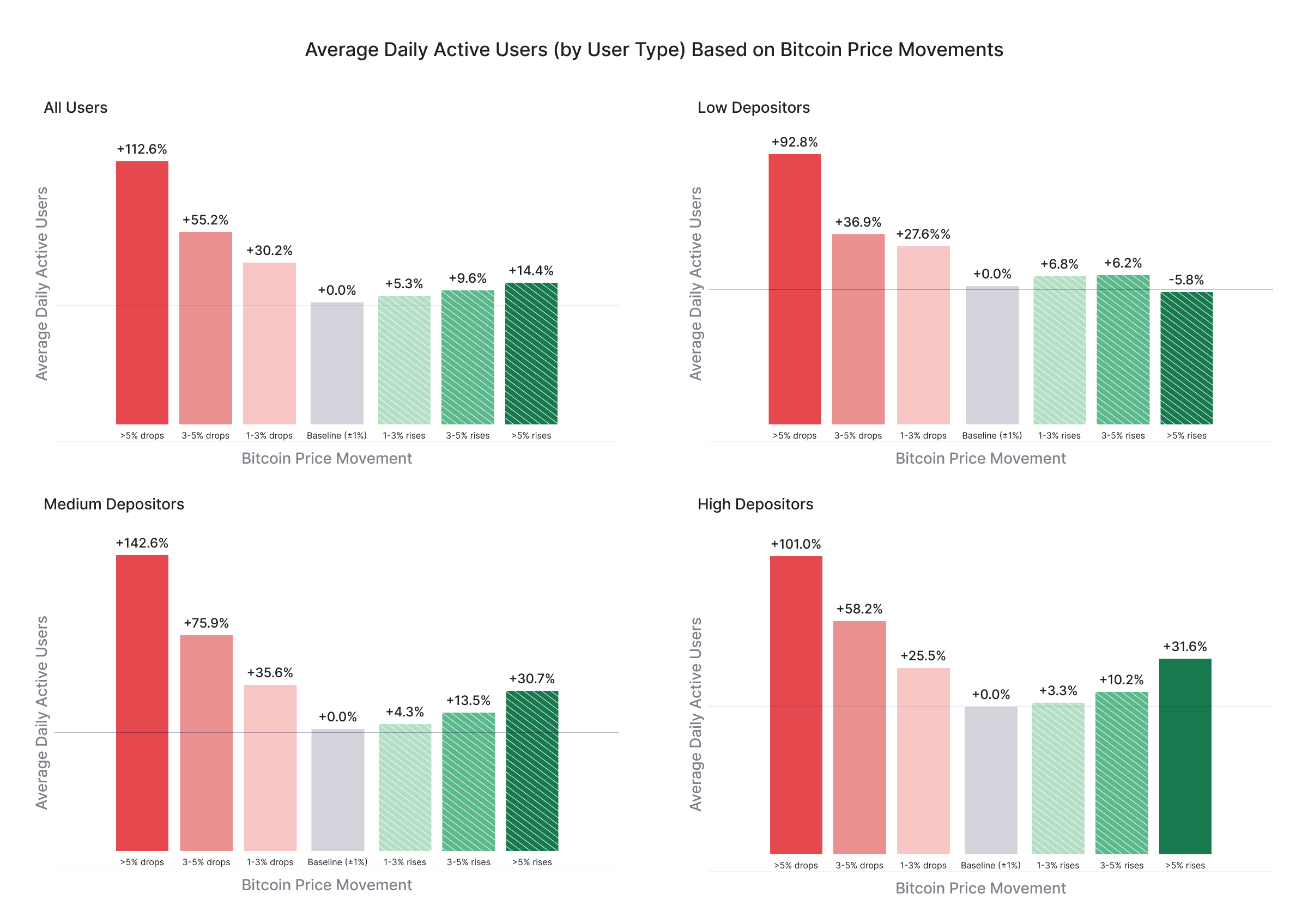 Across low, medium, and high depositing user classes, daily active users increase by up to 142% when Bitcoin plummets, while there are little to no significant changes in daily active users when Bitcoin rises, as compared to stable market conditions.