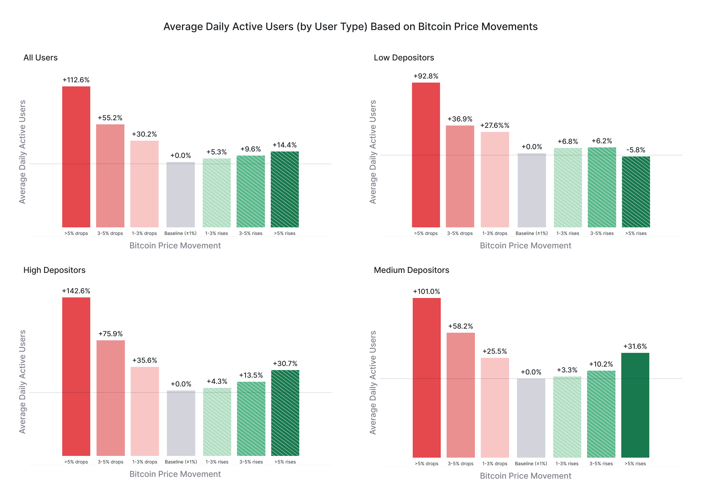 Across low, medium, and high depositing user classes, daily active users increase by up to 130% when Bitcoin plummets, while there are little to no significant changes in daily active users when Bitcoin rises, as compared to stable market conditions.